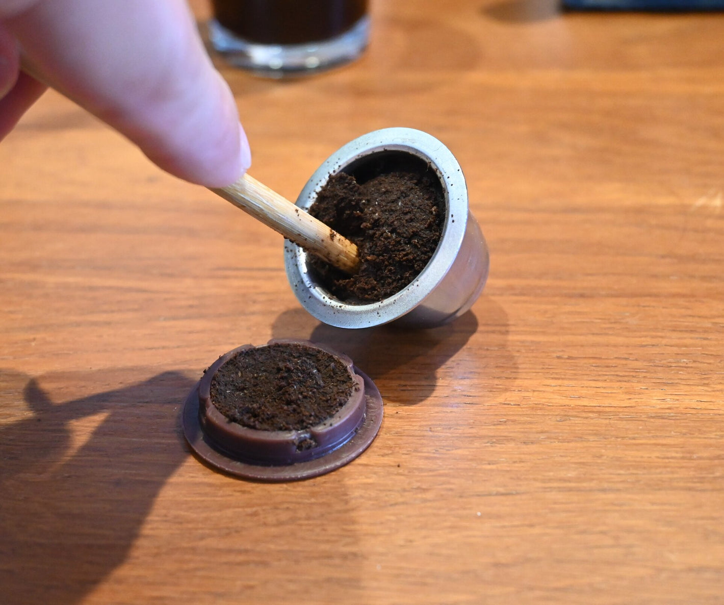 12) Nettoyage - Ouvrez la capsule et retirez le marc à l'aide du manche d'une cuillère ou d'une baguette chinoise.